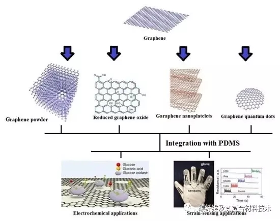 此外,还有一些导电聚合物,例如聚苯胺(PANI)、聚乙炔(PA)、聚吡咯(PPy)和聚(3,4-乙烯二氧噻吩)聚苯乙烯磺酸盐(PEDOT:PSS),它们需要极少量甚至不需要金属纳米颗粒来形成导电通路。在上述聚合物中,聚二甲基硅氧烷(PDMS)性质相似,两者都具有化学惰性、光学透明、疏水性,且大多具有生物相容性,因此PDMS与石墨烯形成复合材料的材料。此外,已知PDMS与纳米填料形成强界面结合。这些复合材料可以为目前可用的健康手环、葡萄糖传感器和智能手表增加新的维度,用于监测人体生理状态的响应性和准确性。